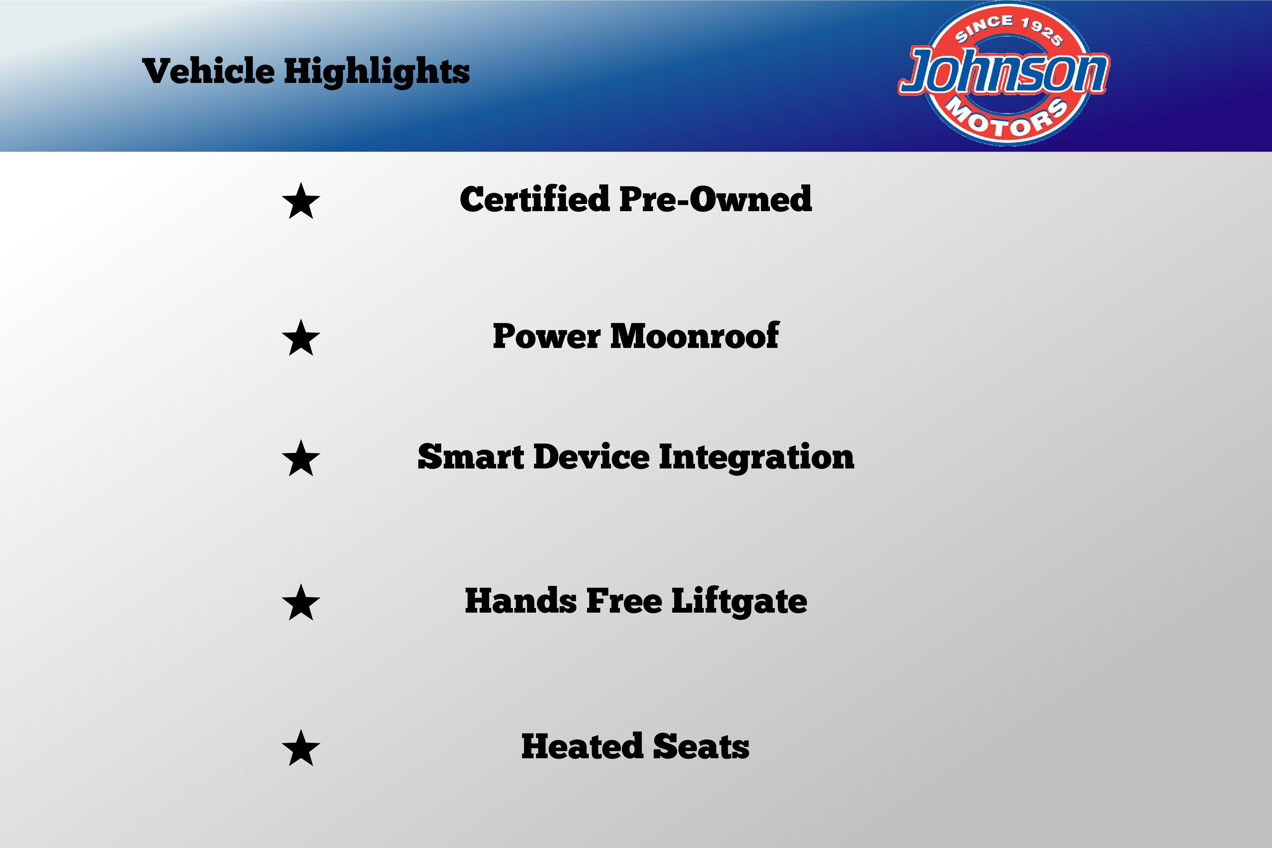 Backed by Trusted Dealership Legacy --- Purchasing from Johnson Motors means you get a vehicle supported by 100 years of customer service, local reputation, and long-term support.