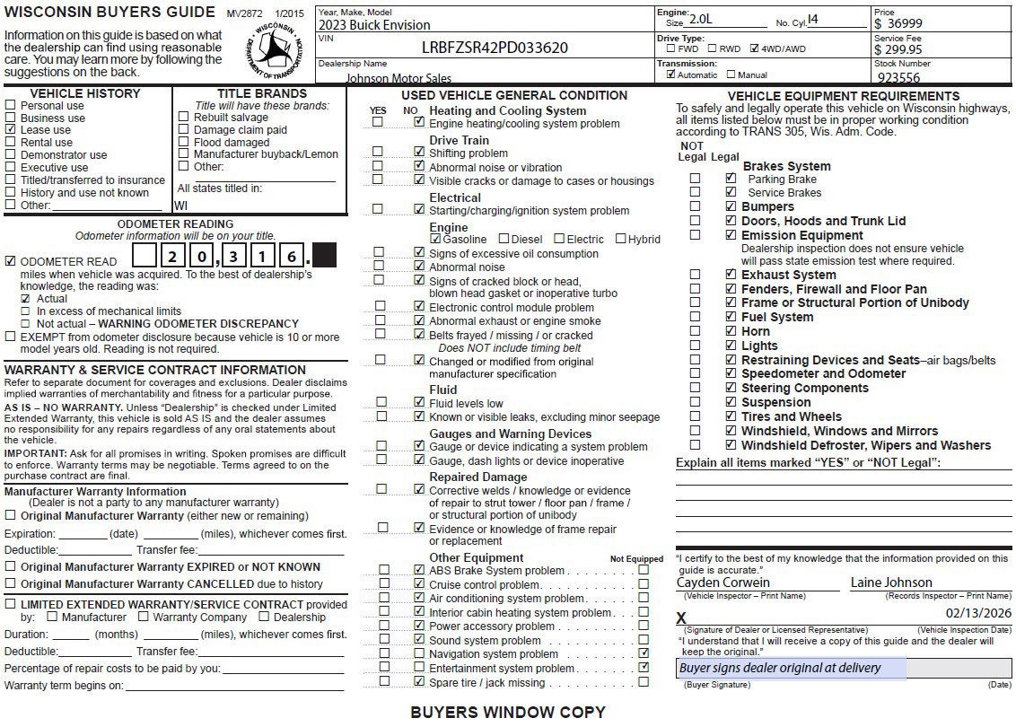 Accident Free, AWD, 2.0L, Sunroof, Navigation System, Cooled Seats, Heated Seats, Leather Seats, Remote Start, Adaptive Cruise Control, Lane Keep Assist, Head-Up Display.Local 1-owner Trade!This vehicle comes with a certified bumper-to-bumper limited factory warranty that ends 02/09/2027 or 48011 and a powertrain limited factory warranty that ends 02/09/2029 or 100000Price does not include sales tax, title, registration, or $299.95 service fee.Only 20,316 Miles! Scores 29 Highway MPG and 22 City MPG! This Buick Envision boasts a 2.0L I4 engine powering this Automatic transmission. WHISPER BEIGE SEATS, PERFORATED LEATHER-APPOINTED SEAT TRIM with Ebony interior accents, TRANSMISSION, 9-SPEED AUTOMATIC (STD), SEATS, FRONT BUCKET (STD).*This Buick Envision Features the Following Options *SAPPHIRE METALLIC, NOT EQUIPPED WITH SECOND KEY FOB see dealer for details. Beginning with start of production, certain vehicles will be forced to include (R6I) Not Equipped with Second Key Fob, which removes second key fob. Vehicles equipped with (R6I) Not Equipped with Second Key Fob will be eligible for later dealer retrofit. See the window label for the features on a specific vehicle., LPO, CARGO NET, HORIZONTAL, HEADLAMPS, LED, ENGINE, 2.0L TURBO, 4-CYLINDER, SIDI (228 hp [170 kW] @ 5000 rpm, 258 lb-ft of torque [350 N-m] @ 1500-4000 rpm) (STD), AXLE, 3.47 FINAL DRIVE RATIO, AVENIR PREFERRED EQUIPMENT GROUP includes standard equipment, AUDIO SYSTEM, 10.2 DIAGONAL BUICK INFOTAINMENT SYSTEM WITH NAVIGATION includes multi-touch display, AM/FM/SiriusXM stereo, Bluetooth® streaming audio for music and most phones, Wireless Apple Carplay/Wireless Android Auto for compatible phones, advanced voice recognition, in-vehicle apps, personalized profiles for infotainment and vehicle settings. Includes greater memory (STD), Wireless Charging, Wireless Apple CarPlay/Wireless Android Auto.*Visit Us Today *Stop by Johnson Motor Sales located at 620 Deere Dr, New Richmond, WI 54017 for a quick visit and a great vehicle!