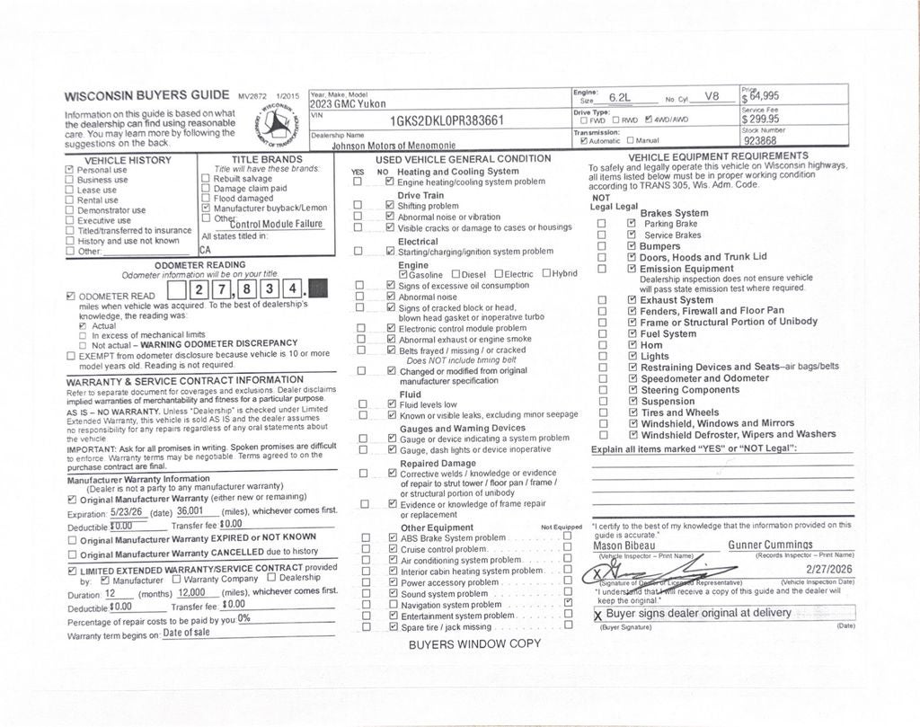 Price does not include sales tax, title, registration, or $299.95 service fee.
