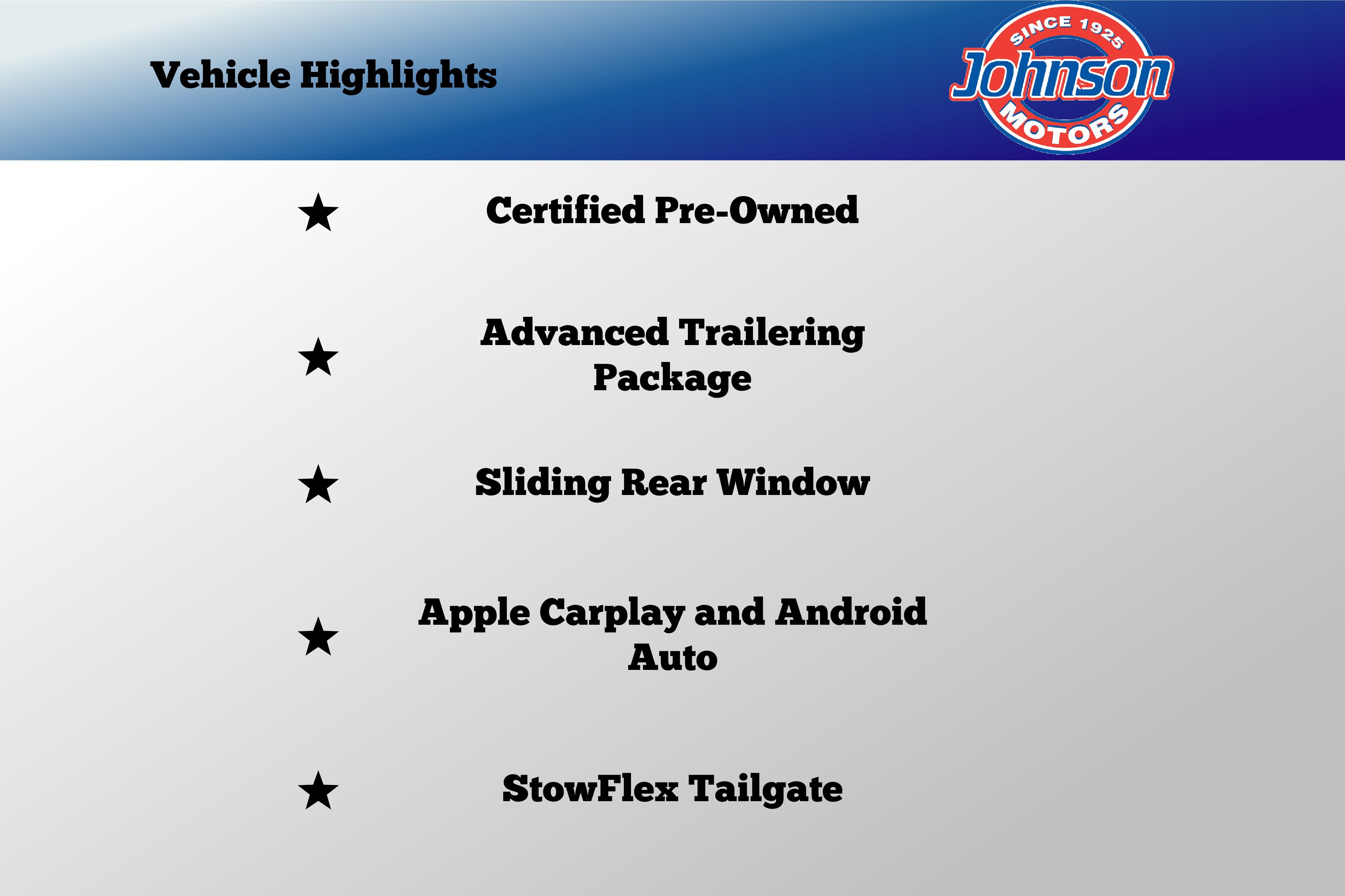 Buying a GM Certified vehicle at Johnson Motors means you are buying peace of mind. Every certified vehicle undergoes a rigorous 172-point inspection and comes with an extended factory warranty, roadside assistance, and a scheduled maintenance program. It's the closest thing to new without the new price tag!