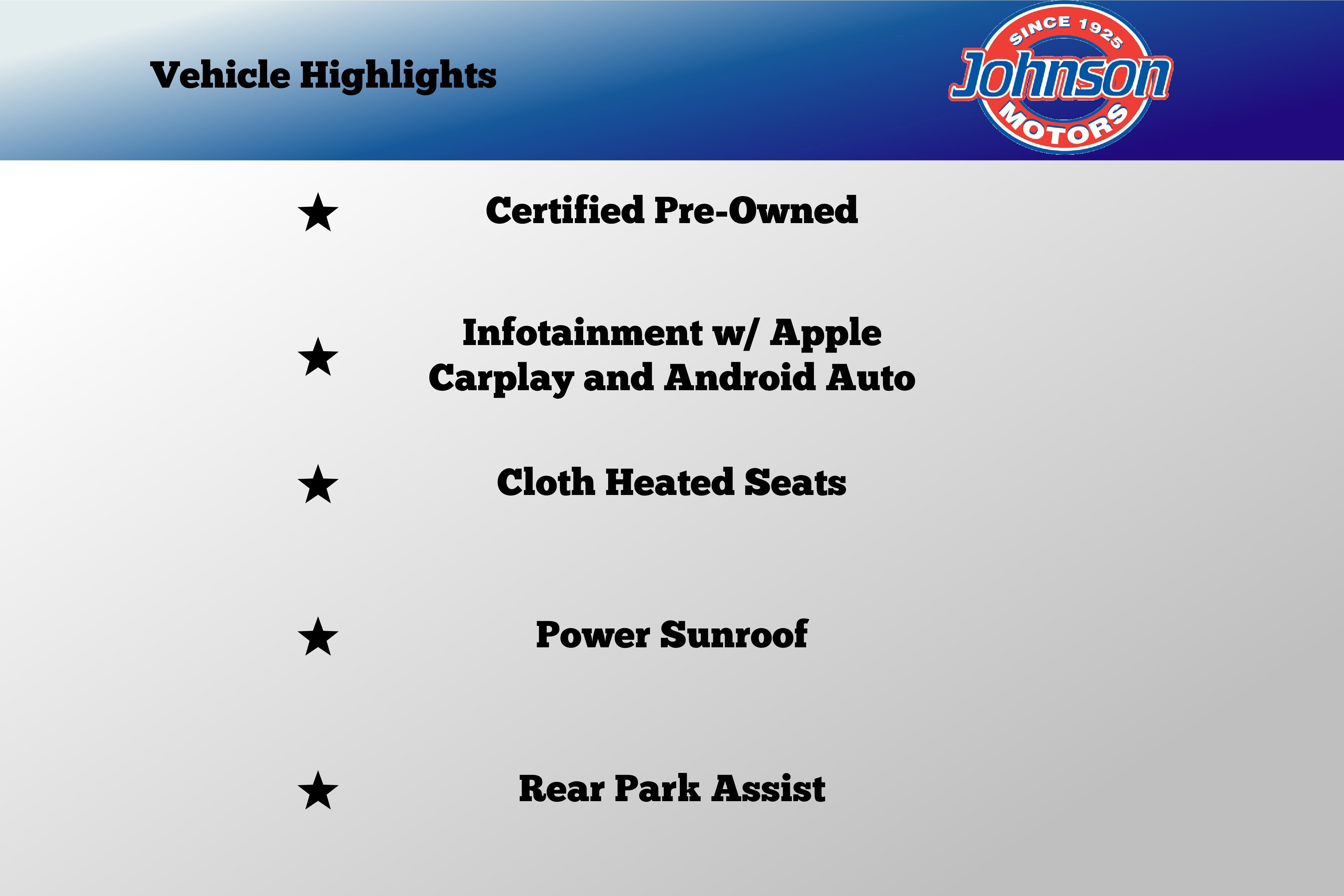 • Backed by Johnson Motors' 100-year legacy --- you're buying from a dealership with deep roots and strong community trust