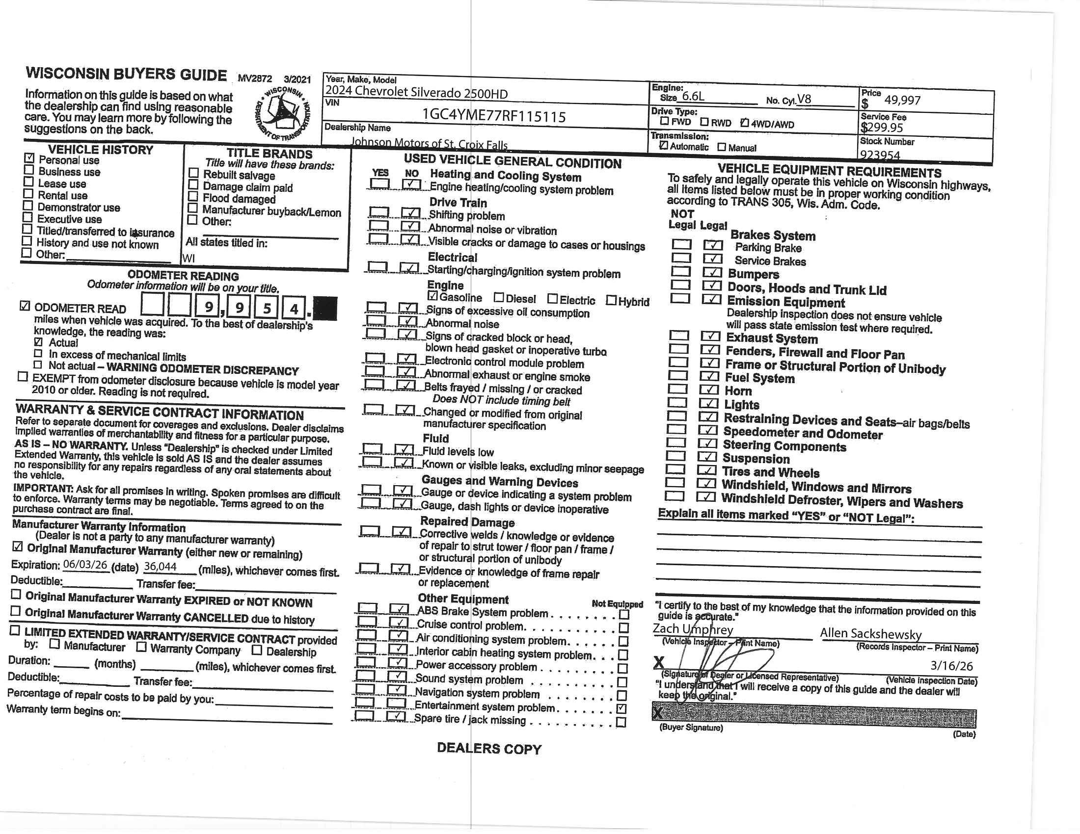 ==== Certified 2024 Chevrolet Silverado 2500HD Custom 4WD ====*Summit White * Heavy-Duty Capability * Z71 Off-Road Ready*Built to handle the toughest jobs with confidence, this *Certified 2024 Chevrolet Silverado 2500HD Custom 4WD* delivers serious power, advanced trailering tech, and rugged durability. Finished in Summit White with a Black cloth interior, it's powered by a proven *6.6L V8* paired with a *10-speed automatic transmission* for smooth, dependable performance.Available now at Johnson Motors of St. Croix Falls in St. Croix Falls.=== Heavy-Duty Performance & Capability === * 6.6L V8 gas engine * 10-speed automatic transmission * Four-Wheel Drive with *2-speed electronic transfer case* * Z71 Off-Road Package with off-road suspension * *Gooseneck / 5th Wheel Prep Package* * Integrated trailer brake controller * 170-amp alternator and heavy-duty cooling=== Work-Ready Features === * Black Chevytec spray-on bedliner * 120-volt bed-mounted and interior power outlets * EZ Lift power lock & release tailgate * Heated vertical trailering mirrors * LED cargo area lighting * Locking tailgate and theft-deterrent system=== Interior Comfort & Convenience === * 10-way power driver seat with lumbar support * Remote start and keyless entry * Rear 60/40 folding bench seat * Rubberized vinyl floor mats front and rear * Dual rear USB charging ports=== Technology & Connectivity === * Chevrolet Infotainment System with *wireless phone projection* * Bluetooth® connectivity * Wi-Fi hotspot capability * 3.5 Driver Information Center display * SiriusXM® with 360L=== Safety & Driver Assistance (CX Safety Package) === * Lane Change Alert with Side Blind Zone Alert * Rear Cross Traffic Alert * Rear Park Assist * HD Rear Vision Camera * Hill Descent Control=== Chevrolet Certified Confidence ===This *Certified Pre-Owned Silverado* has passed a rigorous inspection and includes added factory-backed benefits for peace of mind.