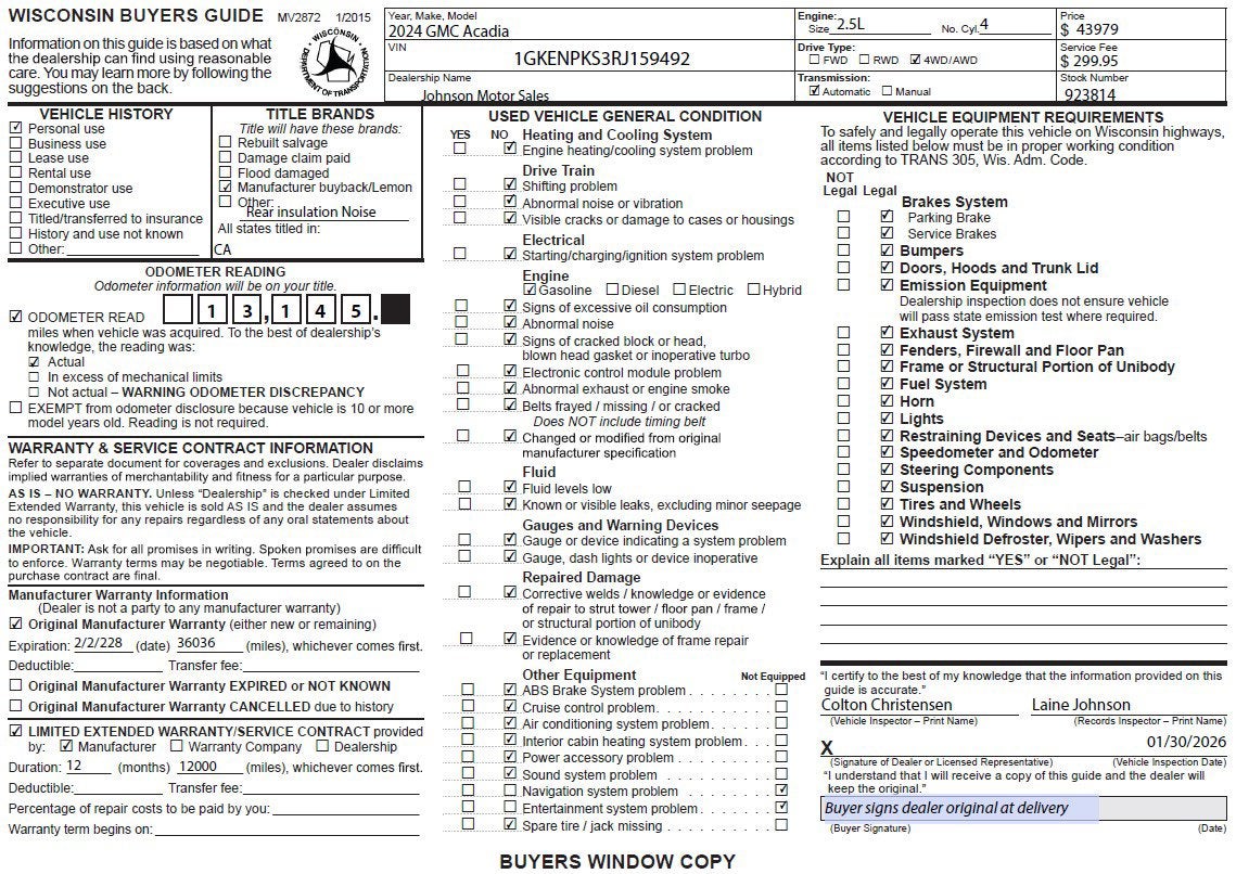 This vehicle comes with a bumper-to-bumper limited factory warranty 12 Months or 12,000 Miles. It also comes with a powertrain limited factory warranty that ends 02/02/2030 or 60036