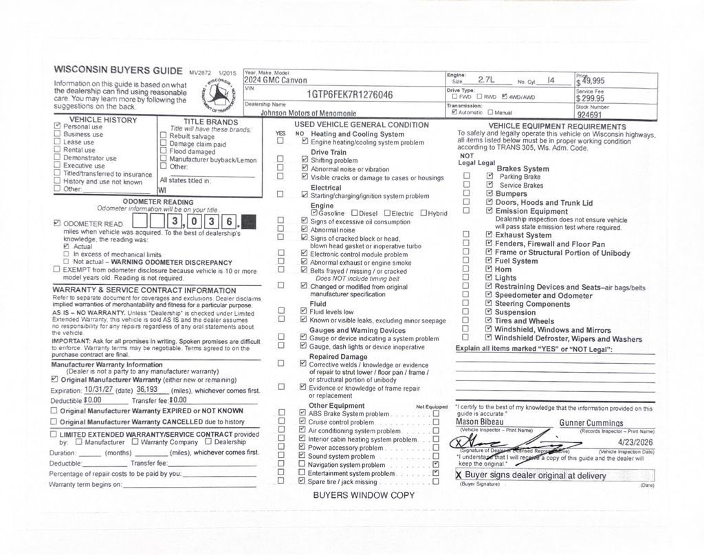 Price does not include sales tax, title, registration, or $299.95 service fee.