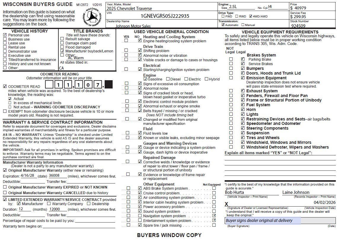 Accident Free, 7 Passenger, Remote Start, Adaptive Cruise Control, Lane Keep Assist, Heated Seats, Leather Seats, Tow Package.1-owner!This vehicle comes with a bumper-to-bumper limited factory warranty 12 Months or 12,000 Miles. It also comes with a powertrain limited factory warranty that ends 04/16/2030 or 60008Price does not include sales tax, title, registration, or $299.95 service fee.. bbOnly 11,107 Miles! This Chevrolet Traverse boasts a 2.5L I4 engine powering this Automatic transmission. WHEELS, 18 (45.7 CM) GRAZEN METALLIC MACHINED-FACE ALUMINUM (STD), TRANSMISSION, 8-SPEED AUTOMATIC (STD), TRAFFIC SIGN RECOGNITION.*This Chevrolet Traverse Comes Equipped with These Options *LICENSE PLATE FRONT MOUNTING PACKAGE (will be forced on orders with ship-to states that require a front license plate) , TIRES, 255/65R18 ALL-SEASON BLACKWALL (STD), STERLING GRAY METALLIC, SEATS, FRONT BUCKET (STD), SEATING, 7-PASSENGER (2-2-3 SEATING CONFIGURATION) (STD), REAR PEDESTRIAN ALERT, POWER OUTLET, 120-VOLT, LOCATED ON THE REAR OF CENTER CONSOLE, LT PREFERRED EQUIPMENT GROUP Includes standard equipment, LT JET BLACK, EVOTEX SEAT TRIM, HD SURROUND VISION.*Visit Us Today *Treat yourself- stop by Johnson Motor Sales located at 620 Deere Dr, New Richmond, WI 54017 to make this car yours today!